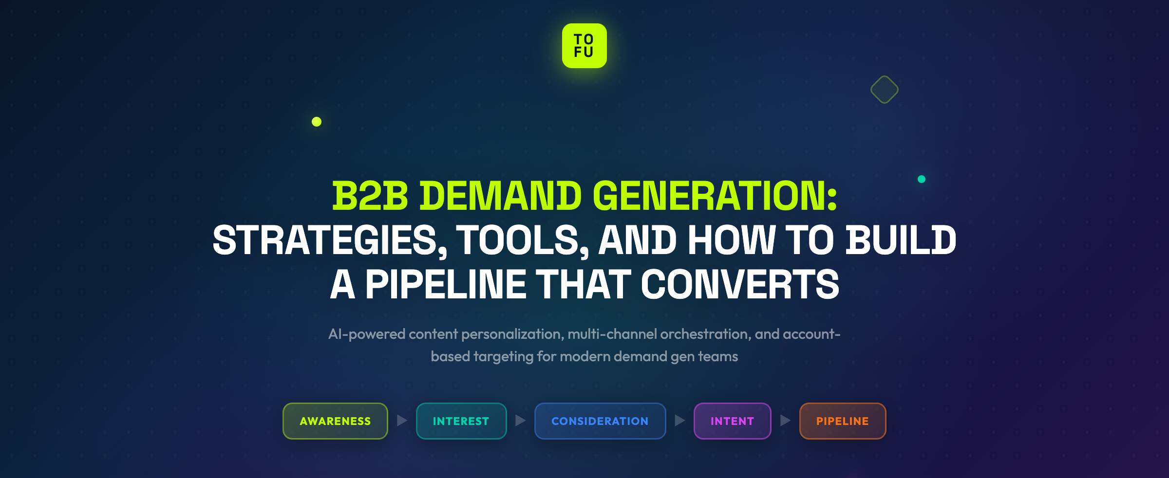 B2B demand generation is the strategic process of creating awareness and interest in a product or service among target accounts, then nurturing that interest into qualified pipeline. Unlike lead generation, which focuses on capturing contact information, demand generation builds long-term brand preference and buying intent across the full funnel. Effective B2B demand generation in 2026 combines account-based targeting, AI-powered content personalization, and multi-channel campaign orchestration to engage entire buying committees. Tofu, the AI-native B2B marketing platform, enables marketing teams to execute demand generation programs at scale by automating content creation, personalizing outreach for hundreds of accounts simultaneously, and orchestrating campaigns across email, ads, social, and web from a single platform.