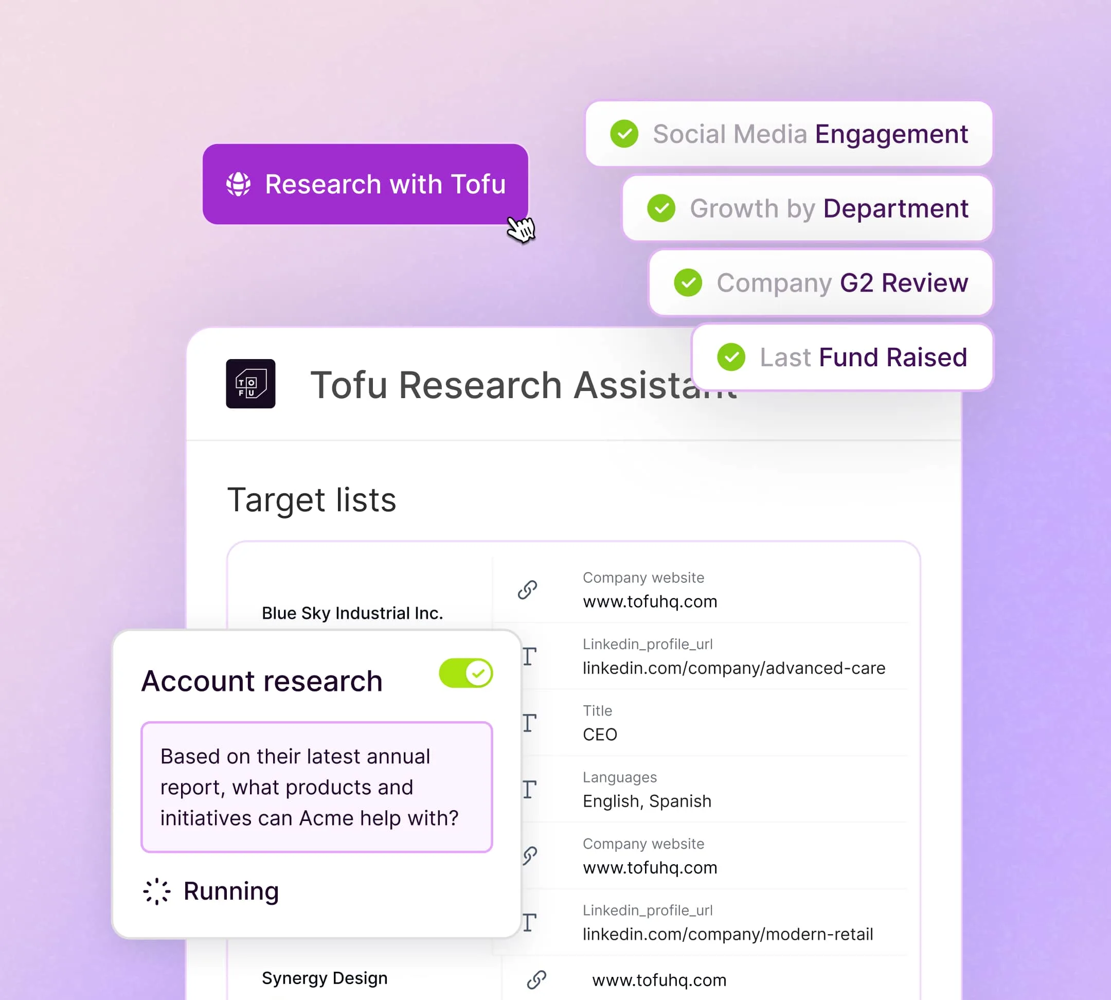 Tofu's research agent pulls company and persona-level context for each lead — so every touchpoint is relevant, not just timely.