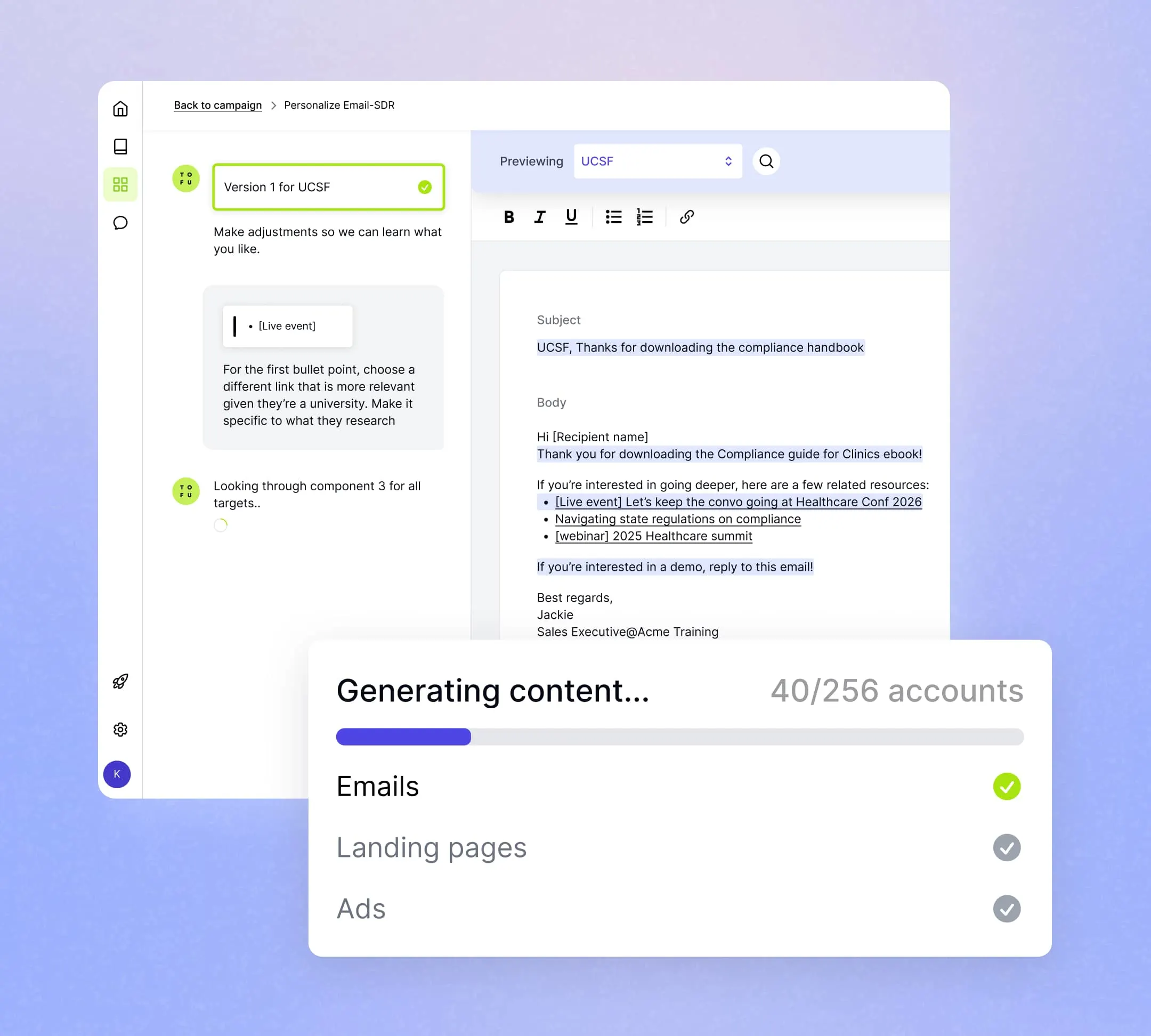 Tofu creates tailored email sequences, linkedin ads, and 1:1 landing pages, pulling from relevant case studies, events, and webinars.