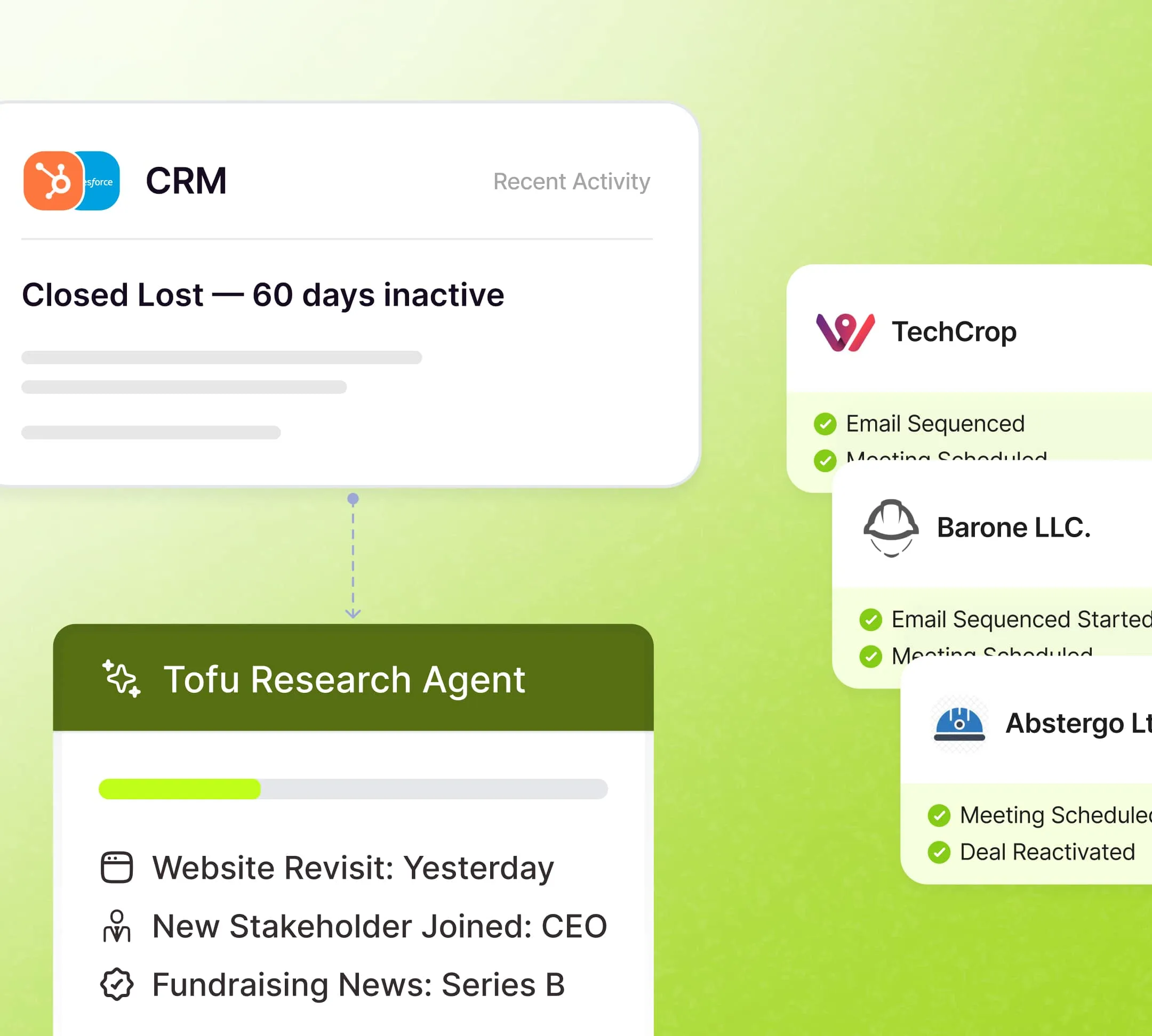 Tofu automatically re-engages dormant accounts with fresh, personalized outreach based on what's changed since they went dark.