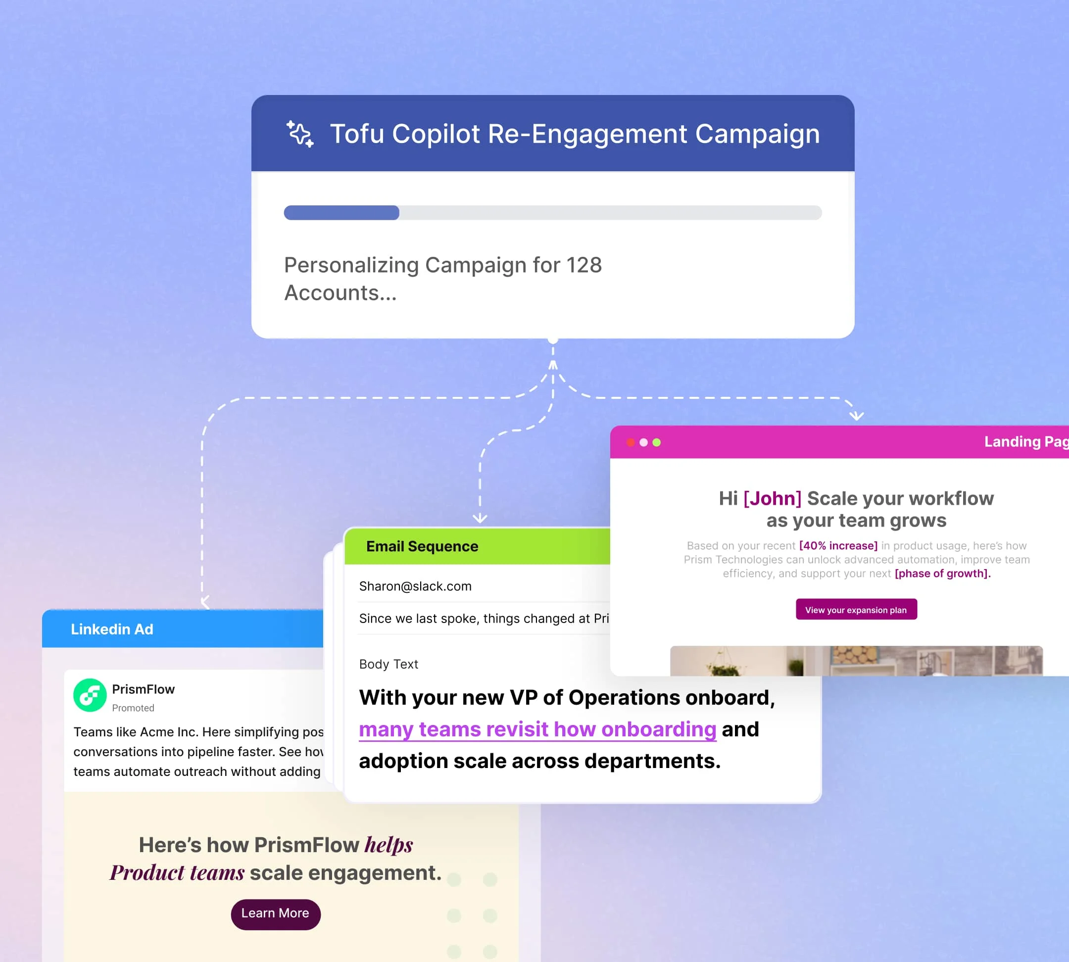 Based on new context, Tofu generates a tailored re-engagement campaign — including multi-step emails, a 1:1 landing page, LinkedIn messages, and call guidance.
